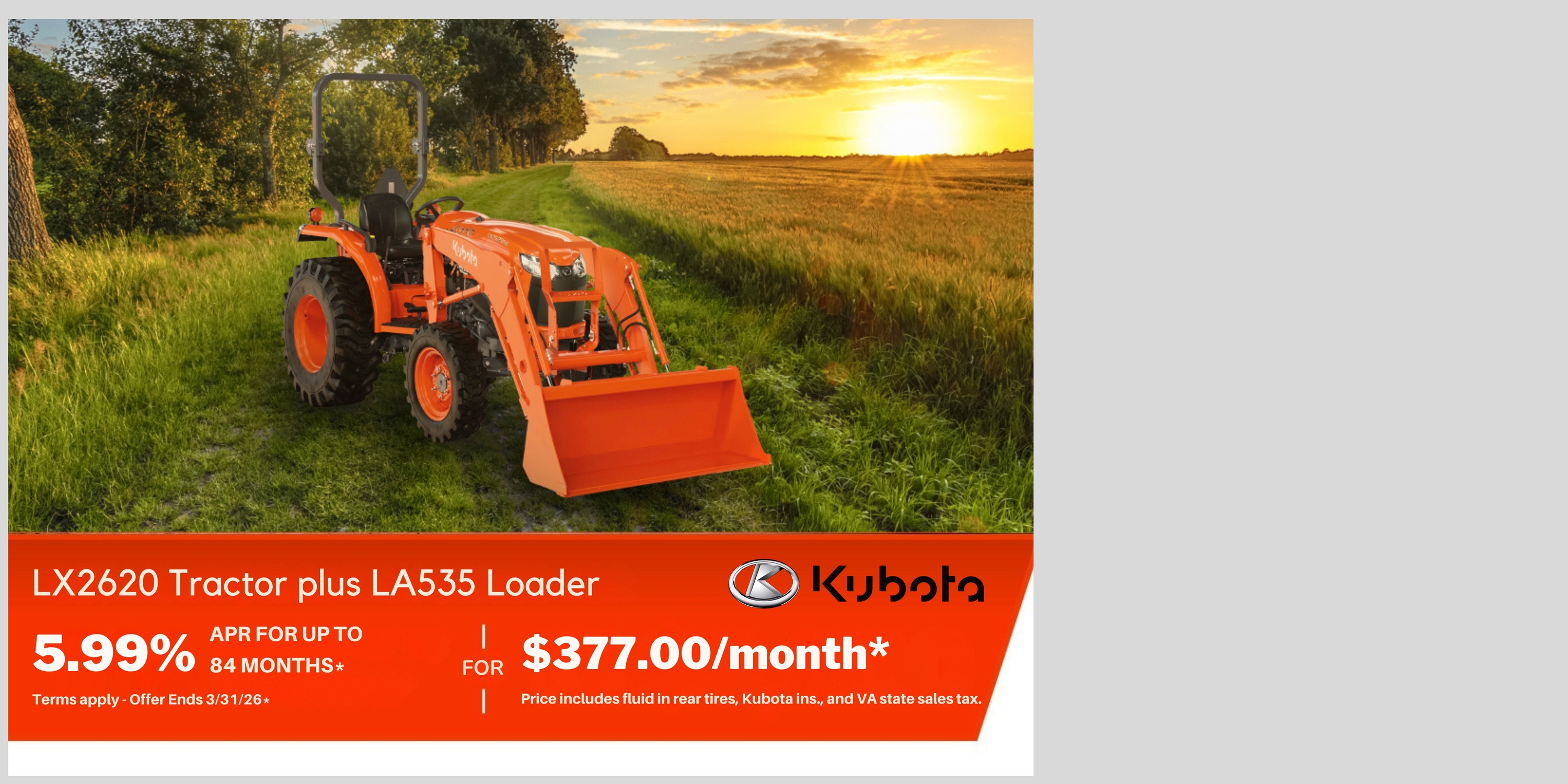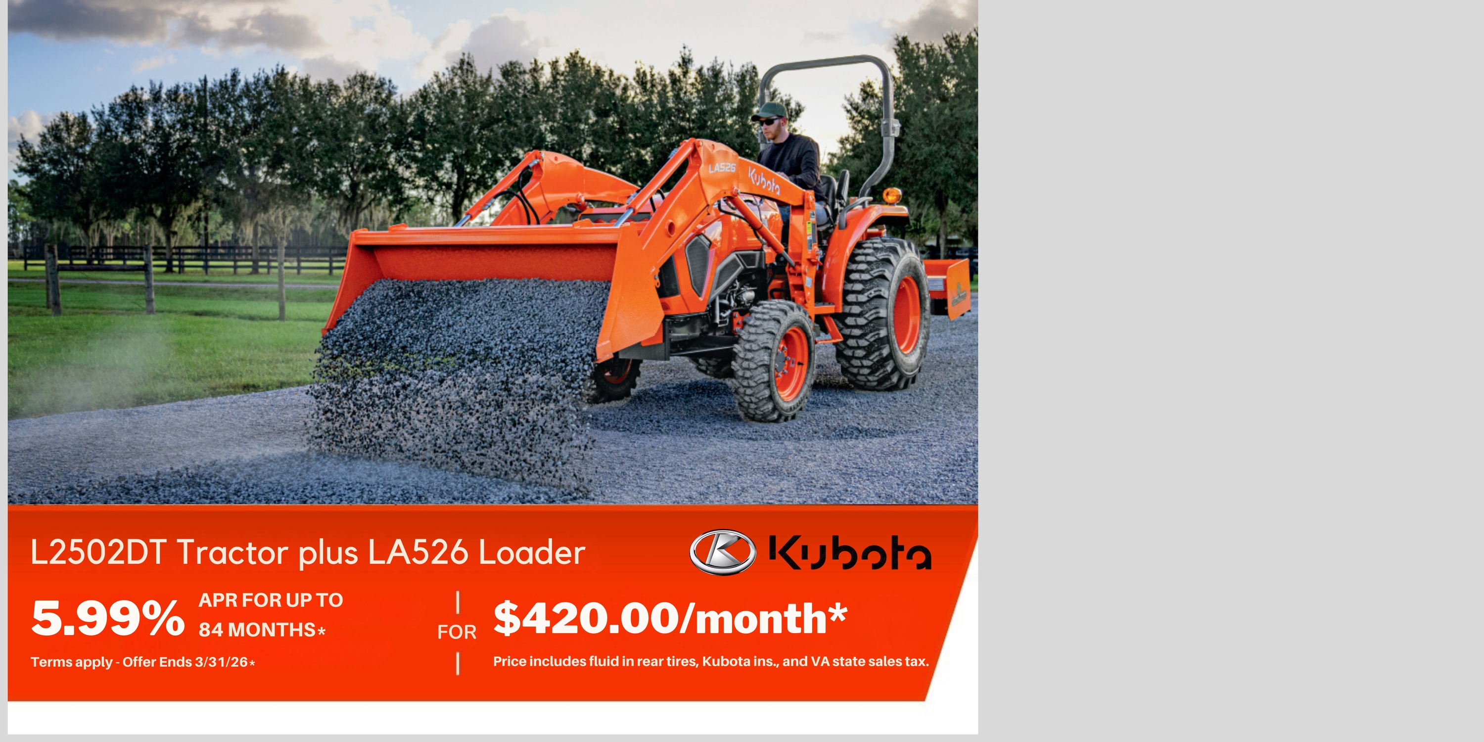 Explore our full lineup of new Kubota equipment — built for performance, comfort, and reliability across Virginia and West Virginia.